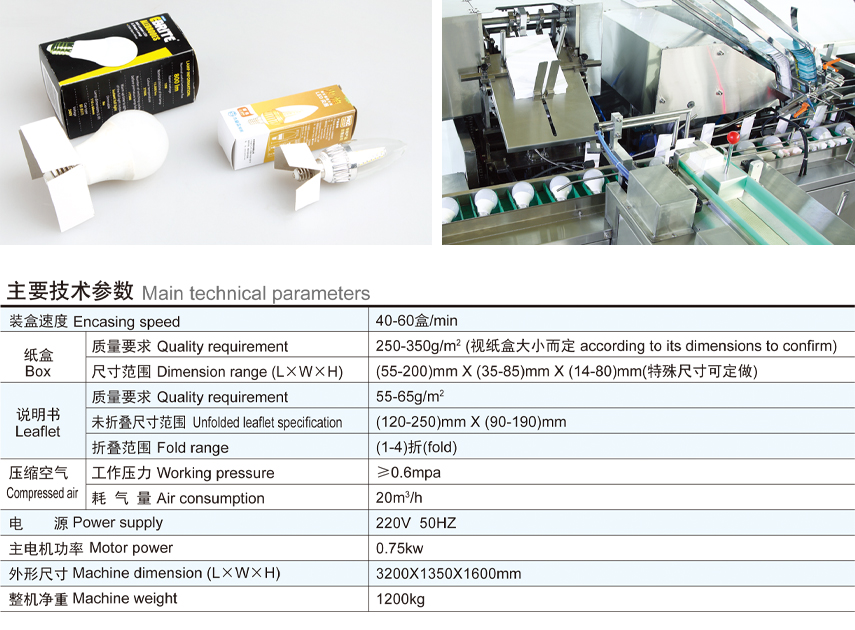 This product is a new type of advanced packaging machinery and equipment that combines the advanced technology of foreign packaging machines with the actual conditions of the current lighting, electronics and other industries. It is a high-tech product integrating machine, electricity, gas and light. This product is suitable for all kinds of bulbs, candles (tail) lamps, downlights, spotlights, single- ended fluorescent lamps, energy-saving lamps, ballasts, etc. in the lighting, electronics and other industries, as well as the packaging of similar iterms. The machine also has the functions of automatically completing the folding of the instruction manual, automatic opening of the carton, automatic feeding of the single-sided inner lining, automatic packing and sealing of the article with the lining and the manual. At the same time, it is also an advanced automatic packaging equipment that solves the current dificult recruitment and difcult management and replaces the labor force. The machine can be used alone or in conjunction with other equipment to form a complete production linkage line.